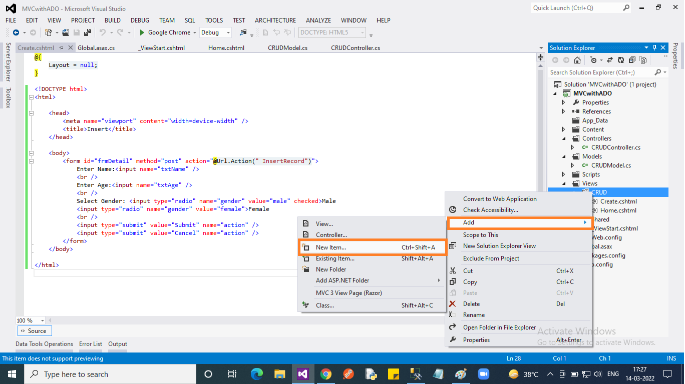 - Right-click on the “CRUD” folder under the “Views” folder in the context menu select “Add” then choose “View..”.