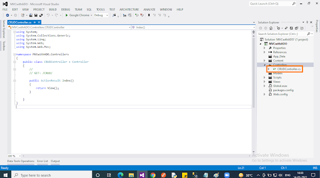 Add an “Empty” Controller by right-clicking on the “Controller” folder. Select “Add” then select “Controller..”. In the popup select “MVC 5 Controller”, then click “Add”. In the next popup, you should give the name “CRUDController”.